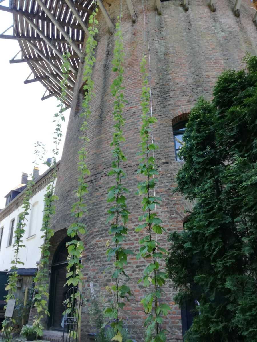 Der Garten an der Mühle bietet sich bestens an um eigenen Hopfen zu ziehen. So haben die Hobbybrauer hier Drähte vom Boden bis zum Deck der Mühle gespannt, wo nun Cascade und Northern Brewer in die Höhe wachsen.