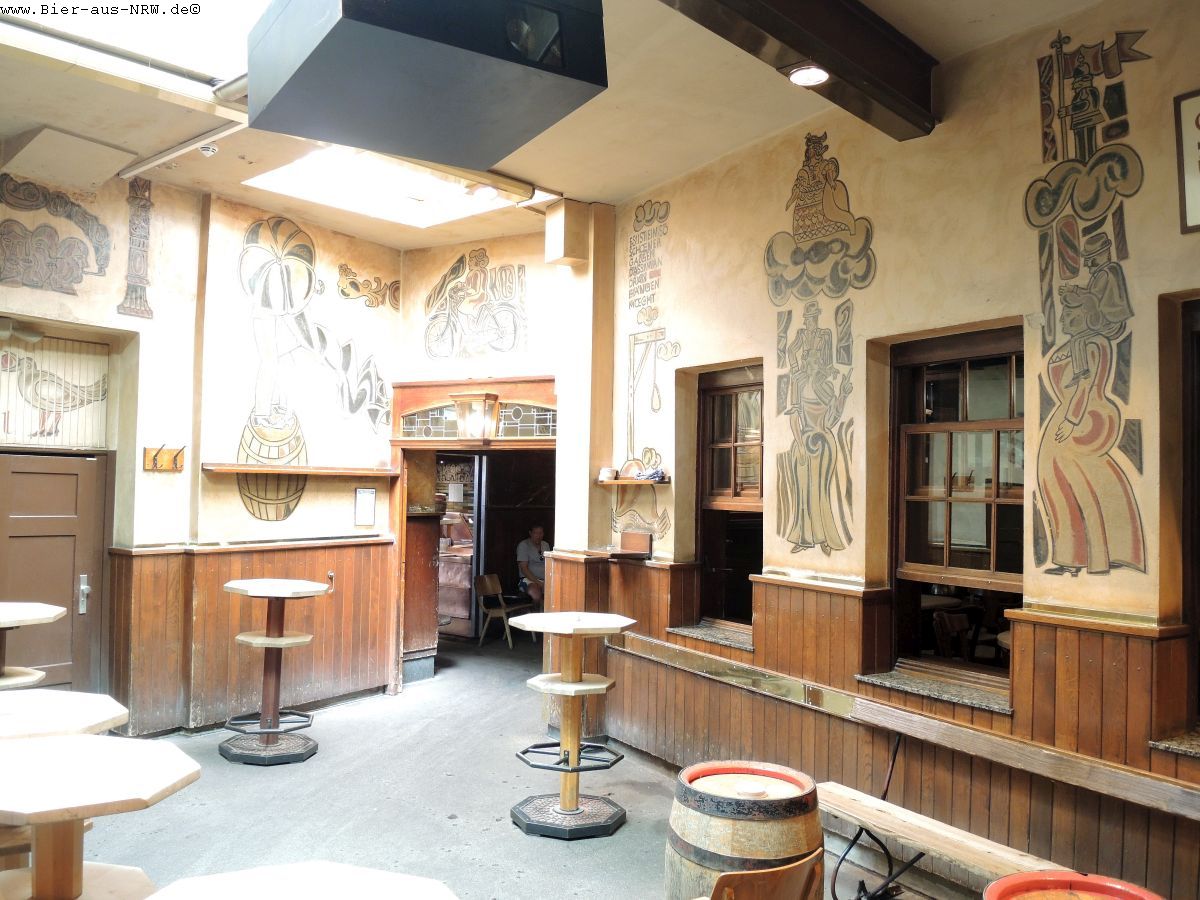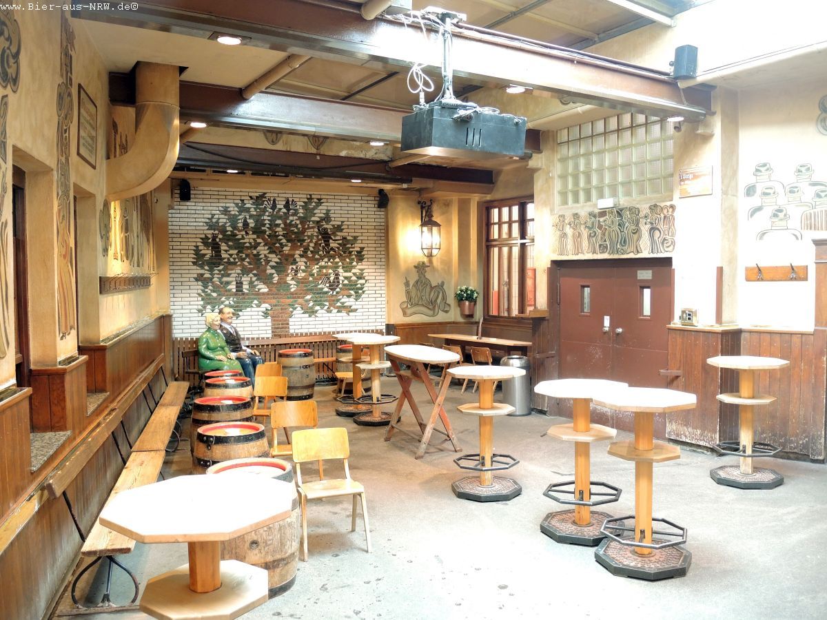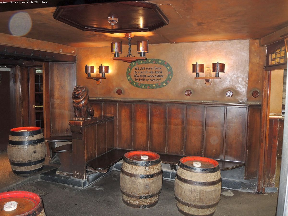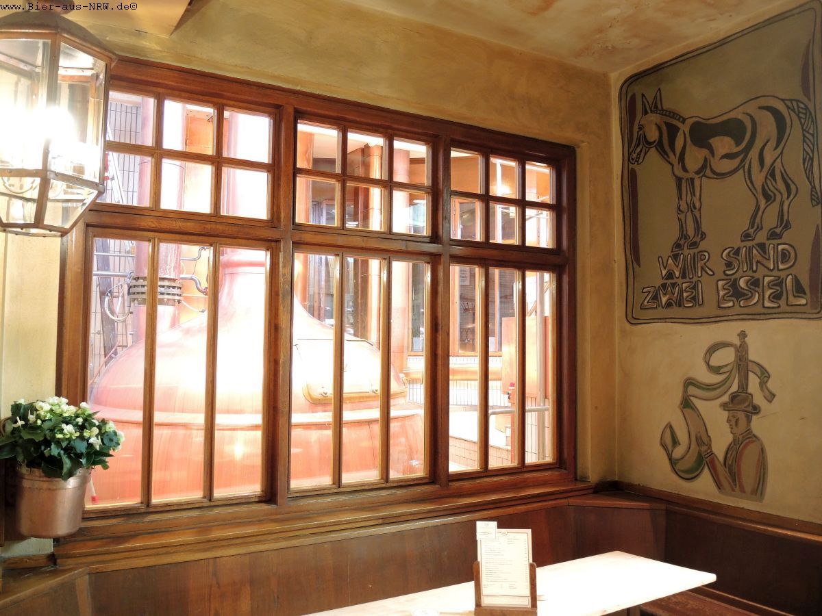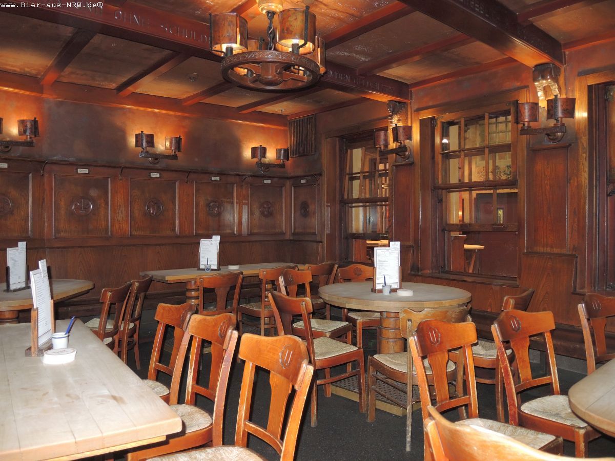Wer die Brauerei zum ersten Mal betritt kommt sich vielleicht wie in einem Labyrinth vor. Im Laufe der vergangenen Jahre wurde immer, wenn es sich ergab, ein Nachbargebäude gekauft und in die Brauerei integriert. Zuletzt das Stickum. So ergibt sich durchaus der Eindruck eines Labyrinths. Ein paar Alt später kennt man sich jedoch bestens aus in dem Gemäuer. Holzvertäfelt ist es. An langen Holztischen kann man in großen wie in kleinen Räumen sitzen, sein Alt genießen und kommt mit seinen Mitmenschen ins Gespräch. Je nachdem wo man seinen Platz gefunden hat, hat man die Brauanlage im Blick, oder man kann dem Zappes bei der Arbeit beobachten. Hier wird stets aus dem Holzfass gezapft, eine Zapfanlage sucht man vergebens.