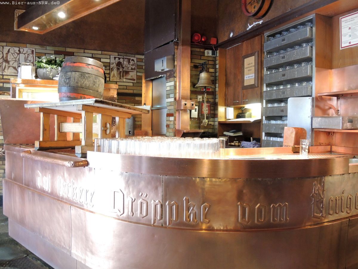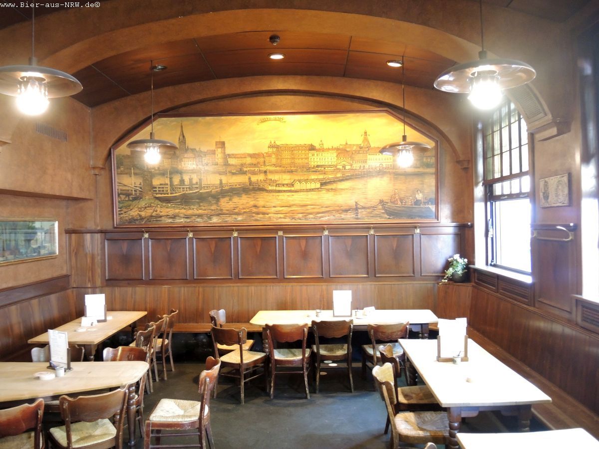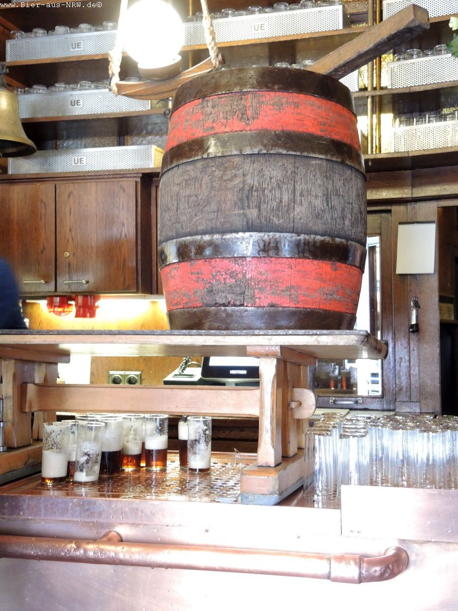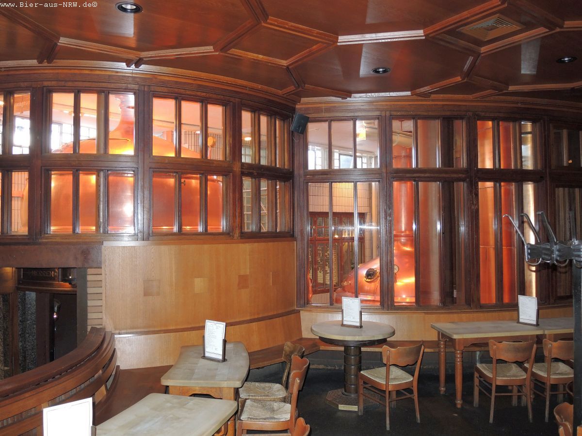 Wer die Brauerei zum ersten Mal betritt kommt sich vielleicht wie in einem Labyrinth vor. Im Laufe der vergangenen Jahre wurde immer, wenn es sich ergab, ein Nachbargebäude gekauft und in die Brauerei integriert. Zuletzt das Stickum. So ergibt sich durchaus der Eindruck eines Labyrinths. Ein paar Alt später kennt man sich jedoch bestens aus in dem Gemäuer. Holzvertäfelt ist es. An langen Holztischen kann man in großen wie in kleinen Räumen sitzen, sein Alt genießen und kommt mit seinen Mitmenschen ins Gespräch. Je nachdem wo man seinen Platz gefunden hat, hat man die Brauanlage im Blick, oder man kann dem Zappes bei der Arbeit beobachten. Hier wird stets aus dem Holzfass gezapft, eine Zapfanlage sucht man vergebens.