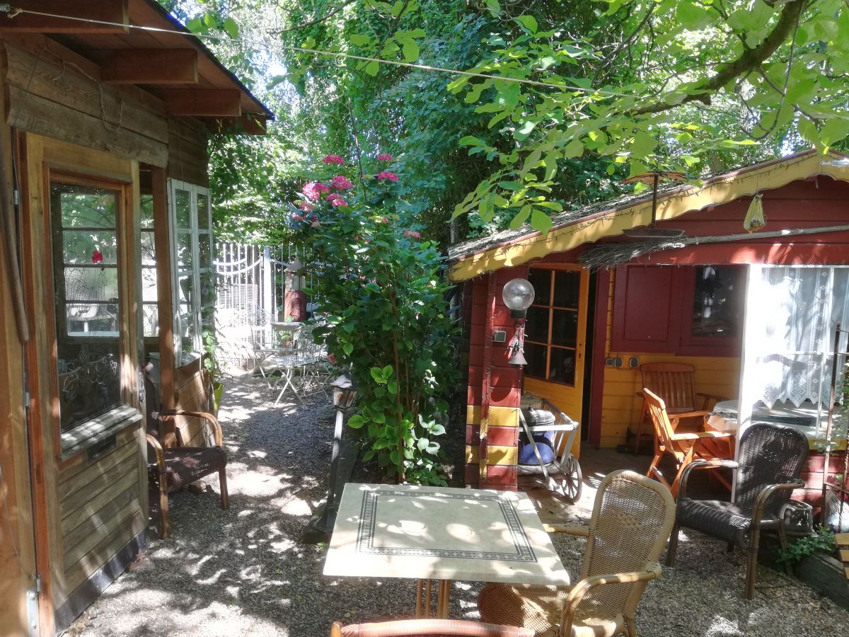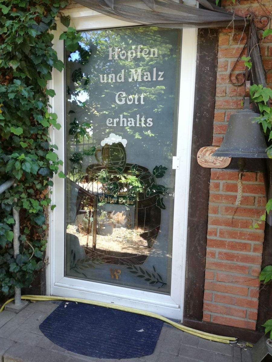 Wer die Biere frisch vom Fass genießen möchte hat dazu unter anderem im hauseigenen verwunschenen Biergarten die Möglichkeit. Vielerlei verschiedenste Sitzgelegenheiten laden hierzu ein. Evtl. kann man je nach Sitzplatz die hauseigenen Hühner beobachten, wie sie über den frischen Treber herfallen. Bei schlechtem Wetter bieten sich im Inneren Räumlichkeiten an. Hopfen regt den Appetit an, Speisen werden hier jedoch keine Angeboten. Was aber niemanden davon abhalten soll einfach seine eigene Brotzeit mitzubringen.